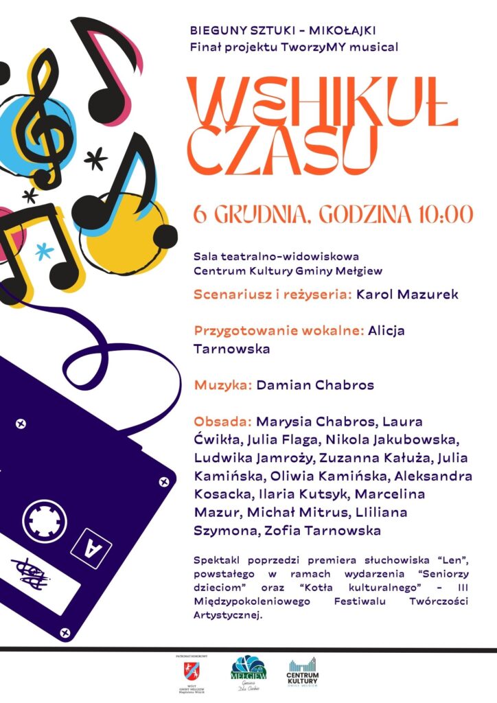 Już niedługo startuje „Wehikuł czasu”, czyli spektakl, który powstał w ramach projektu TworzyMY musical i wydarzenia „Bieguny sztuki – Mikołajki”. Podczas widowiska zwiedzimy różne zakątki świata, przenosząc się między innymi w przyszłość i przeszłość, a także poznając najróżniejsze postaci i stwory, mieszkające w odległych miejscach. Na scenie zobaczymy wspaniałych artystów, czyli: Marysię Chabros, Laurę Ćwikłę, Julię Flagę, Nikolę Jakubowską, Ludwikę Jamroży, Zuzannę Kałużę, Julię Kamińską, Oliwię Kamińską, Aleksandrę Kosacką, Ilarię Kutsyk, Marcelinę Mazur, Michała Mitrusa, LIilianę Szymonę, Zofię Tarnowską.